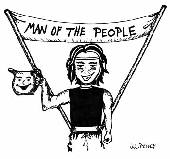 The only candidate with the power to speak directly to the Heavens, James has been told by Galthar the Omniscient that eternal life and bliss is waiting for us all on a glowing purple orb called Brainopia, where we will all be transported in 2001 after completing a complex ritual involving Sunny Delight, Sulfuric acid, and Lou Vega's "Mambo No. 5." | Gary Herman cannot hear the True voices from above. The voices which command him are clearly those of moon-faced Zombie alien-dwarfs from a parallel universe; the same alien-dwarfs who have mistakenly predicted the world would end 4 times. And he doesn‰t even like Sunny Delight. |