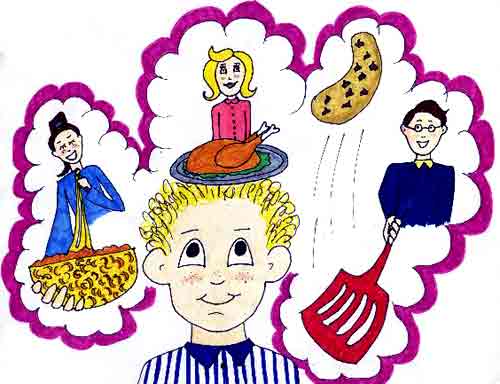 On Sundays, his father flipped flapjacks with gooey chocolate chips inside. Robbie always grabbed handfuls of chips right out of the bag when his father wasn't looking. His older sister, Rachel, would always rat on him because ever since she turned thirteen, she thought she was the smartest person in the whole wide world. But even Rachel, who was a big old bratty rat sometimes, could whip up her famous macaroni and cheese with a crunchy, munchy bread crumb topping that made Robbie's tummy sing. |