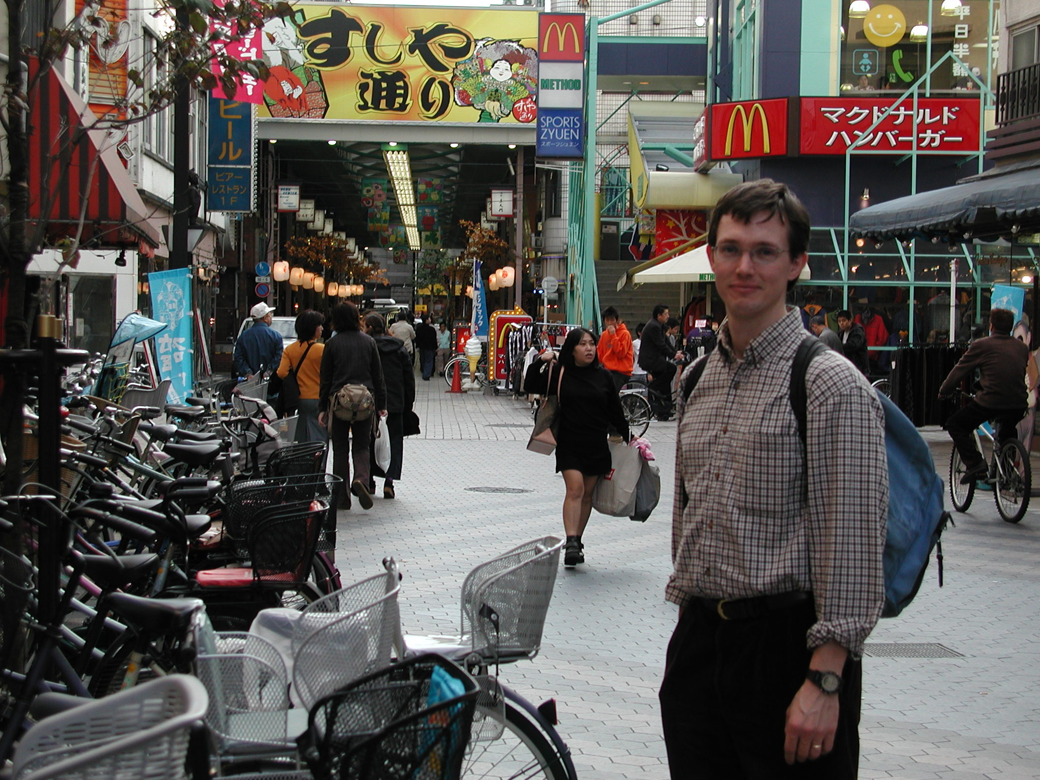 Nov. 7, 2000 Toujours à Tokyo, voici des photos prises de Asakusa. Il y a beaucoup de petites rues avec magazins et restaurants, incluant un McDonald... Il y a aussi un temple qui s'appelle Sensoji. Still in Tokyo, here are pictures taken at Asakusa. There are many little streets with lots of shops and restaurants, including a McDonald. There is also a nice temple called Sensoji. |