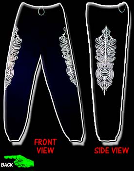 Any TATTOO enthusiast will be "sweating" to get a pair of these original Maori Tribal Sweatpants! The design is based on the tattoos of a mummified head I once viewed of a Maori Chief that was brought to the states during the turn of the century! On the rare occasion that one of these heads come up for sale it will fetch a price of tens of thousands dollars- but these sweatpants won't cost you ANYWHERE near that! This UNIQUE design is printed down each side of the leg! The print itself is huge-almost 25 inches from top to bottom! You'll be bound to loose YOUR head if you don't get these- so go a"head" and add them to your Satan's | ||||||||||||||||||||||